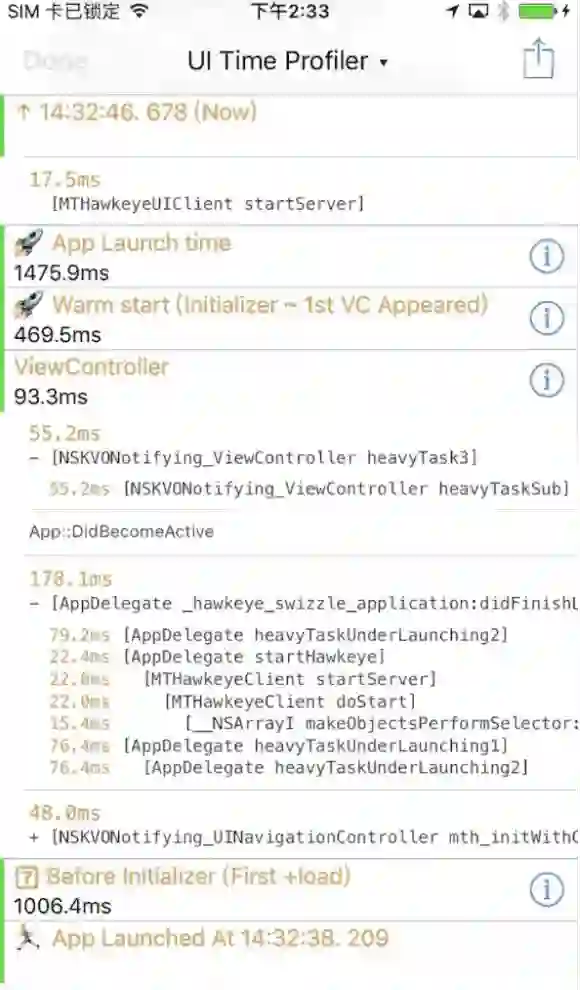 UITimeProfiler 用于辅助主线程耗时任务的优化。内部分成了 VC Life Trace 和 ObjC CallTrace 两部分。VC Life Trace 用于跟踪打开 ViewController 各个阶段的具体时间点,ObjC CallTrace在开启后,则可跟踪耗时大于指定阈值的 Objective-C 方法,类同于 Instrument 的 Time Profiler 功能。