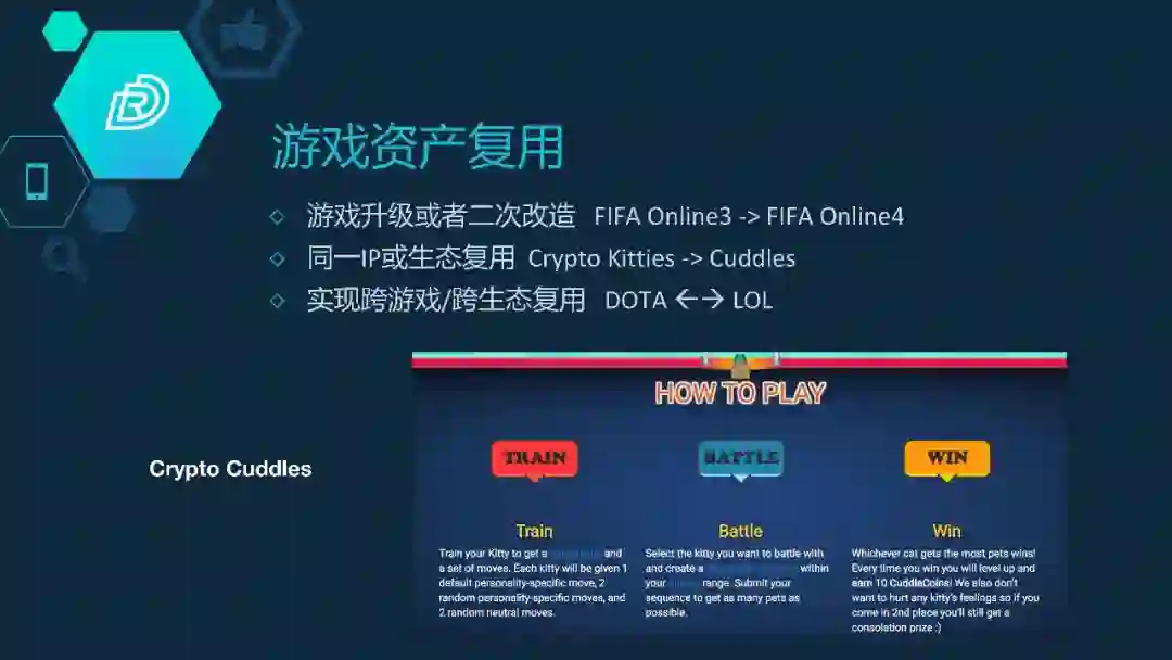 另外一个方面就是从一个IP内部的复用,就比如说Crypto Kitties出了一款猫,只能撸猫,没有很多的玩法。你买了一只猫,本来放在游戏里面是没有用的,后面有一个项目,就是拿你之前买的猫串在一起,你不爱再买猫了,你拿之前买的猫,我这边给你做新的游戏,你可以拿这个去互相PK,带入一些玩法。