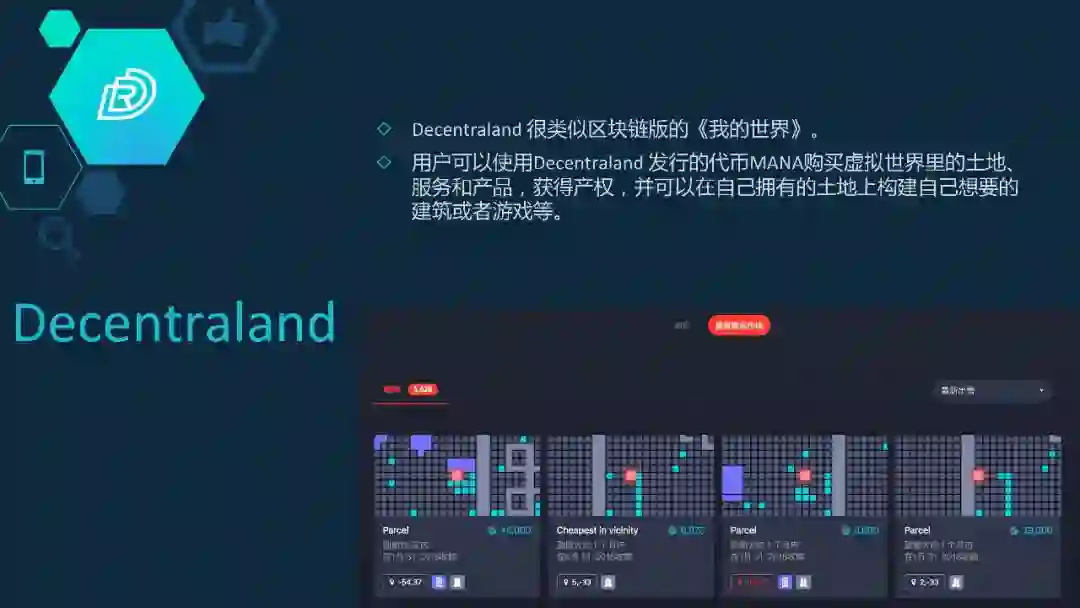 除了这个游戏,还有Decentraland,它跟《我的世界》很像,通过游戏里面的一个token,可以去购买虚拟世界里面的土地。