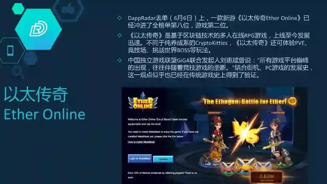 但是在今年又出来一个新的游戏叫Ether Onlin---以太传奇,这是咱们国内的一个团队做的。这个游戏是一个RPG的游戏,跟以前的传奇很像,里面有丰富的系统,这个做得跟现在很多互联网游戏非常接近了,而且它里面很核心的一些系统,都是用区块链的智能合约来做的。