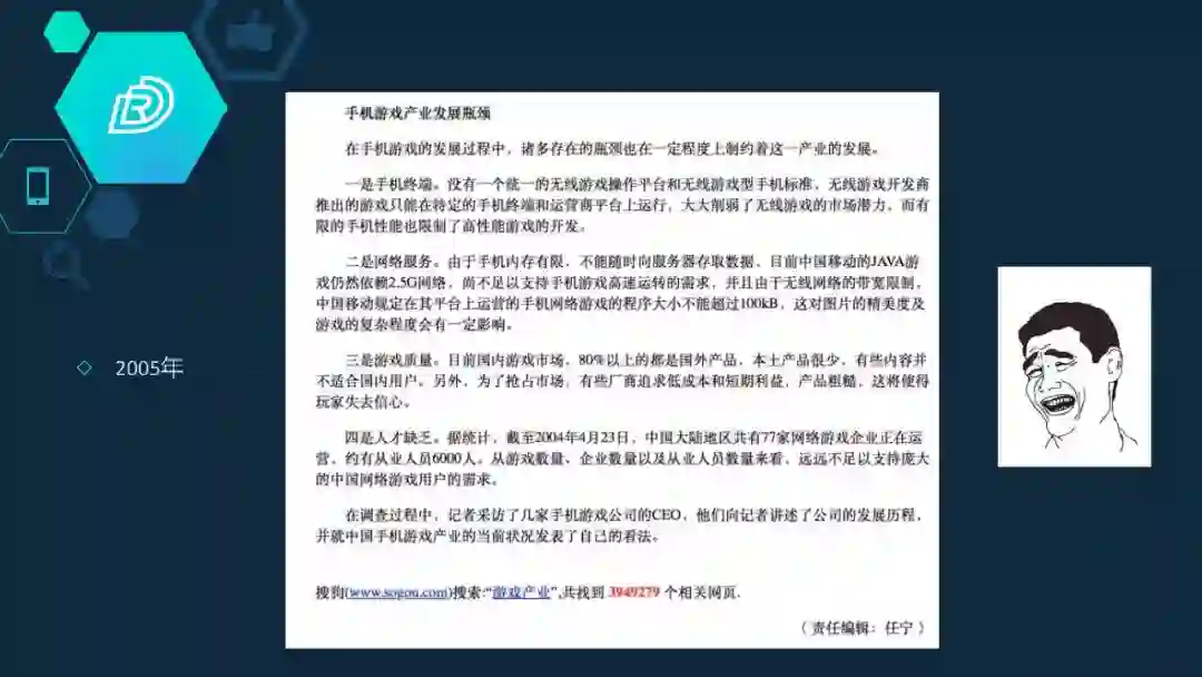 网上搜了一个图,2005年的,当时很多人质疑手机游戏跟现在很多人质疑区块链做游戏是一样的看法。当时说手机终端性能不行,网络不行,2G无法支撑起即时的通讯。然后说游戏的质量以及人才,还是这几样,差不多。