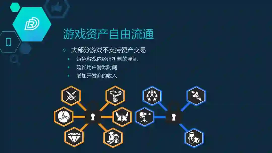 第一个,对游戏资产的自由流通。这个怎么说呢?现在的游戏,你的道具、游戏钱币等都是封闭的,都是孤立的。比如《王者荣耀》里的东西跟《天天酷跑》没法共享。这是从游戏厂商而言,它有自己的出发点。它为了避免内部经济机制的混乱,延长用户的游戏时间、增加开发商的收入。