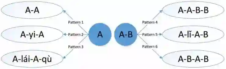 在词法关系方面,作者主要研究了两个内容,一是重叠(Reduplication),二是半词缀(Semi-affixation)。所谓重叠就是词语中的部分汉字以一定的形式发生重叠,从而引起语法或语义差异,作者总结出六种重叠模式,如下图所示。
