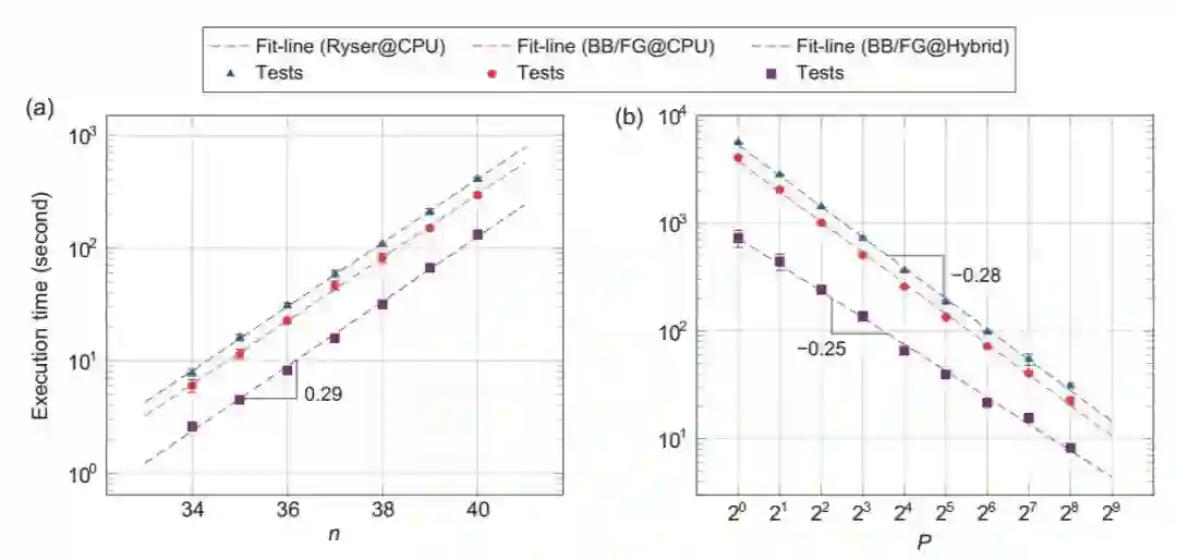 拟合结果如图 2(d)所示,表明使用所有 CPU 和加速器的天河二号全系统计算 50x50 矩阵的积和式执行时间大约是 93.8 分钟,其 95% 置信区间是 [77.41, 112.44] 分钟,这意味着天河二号的执行时间上界是约每 100 分钟生成一个 50 光子样本。