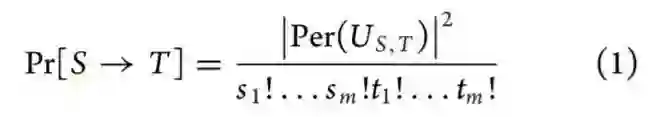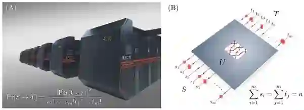 给定一个 m x m 大小的幺正矩阵以及 n 个不可区分的玻色子(如图 1b 所示),在经典计算机上模拟玻色采样的过程是从方程 (1) 描述的分布中进行采样来生成样本: