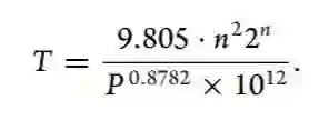 由于精度问题,我们使用 BB/FG 而不是 Ryser 算法的拟合执行时间数据,来分析天河二号的性能极限。拟合方程如下: