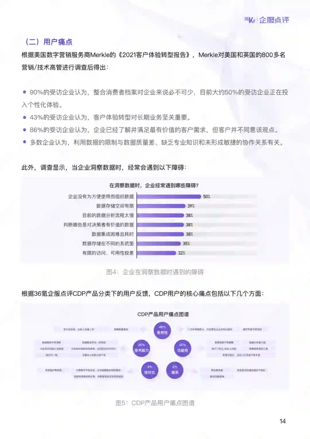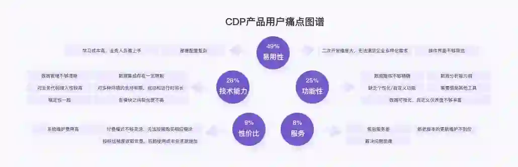CDP产品分类下的⽤户反馈,CDP⽤户的核⼼痛点包括以下⼏个⽅⾯: