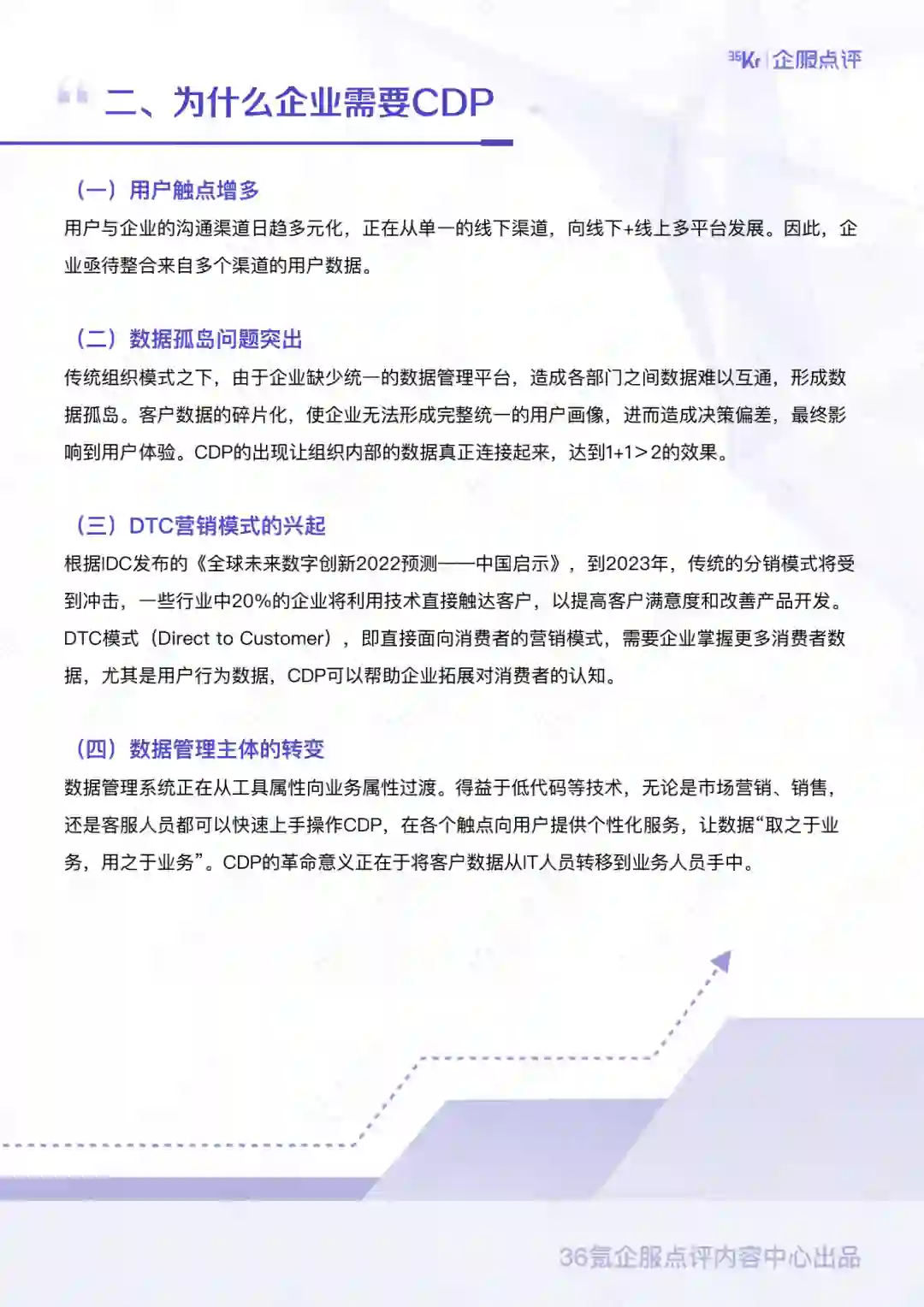 为了帮助更多企业深⼊了解CDP,36氪企服点评特别推出的《客户数据平台(CDP)选型指南》,从概念、⽣态、选型、展望等多个维度,帮助企业唤醒沉睡的数据资产,为企业选择和搭建CDP提供全⾯的知识框架。