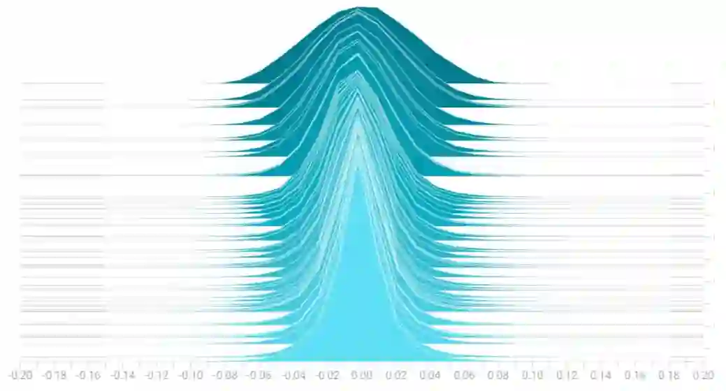 图 4:表示采用 SDR 的 DenseNet-100 的第 21 层第 1 块的权重值频率的直方图,其中每个切片都是来自训练一个 epoch 的 snapshot,而最上面的切片是来自第一个 epoch 的 snapshot。在训练 100 个 epoch 的过程中,随着权值的标准差趋近于零,曲线变窄。