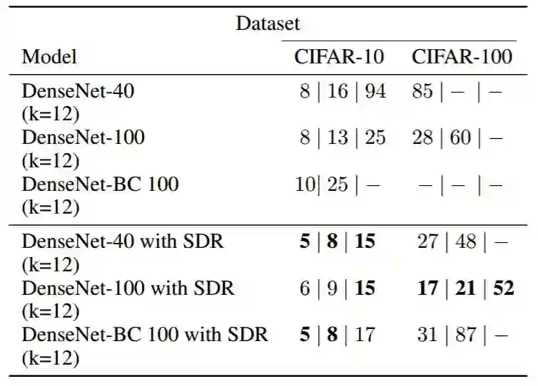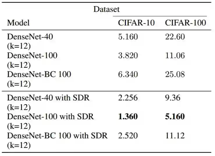 表 1:采用 SDR 的 DenseNet 与采用 dropout 的 DenseNet 误差率对比