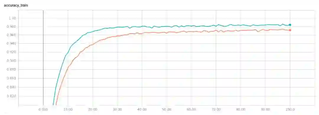 图 3:采用 dropout 的 DenseNet-100 训练 100 个 epoch 之后的准确率(橙色曲线)和采用 SDR 的 DenseNet-100 训练 100 个 epoch 的准确率(蓝色曲线)。比起 dropout,SDR 不仅能够更快地提高训练准确率(训练 17 个 epoch 达到了 96% 的准确率,drouout 达到相同的准确率需要 33 个 epoch),而且还能够在训练 40 个 epoch 后达到 98% 的准确率。