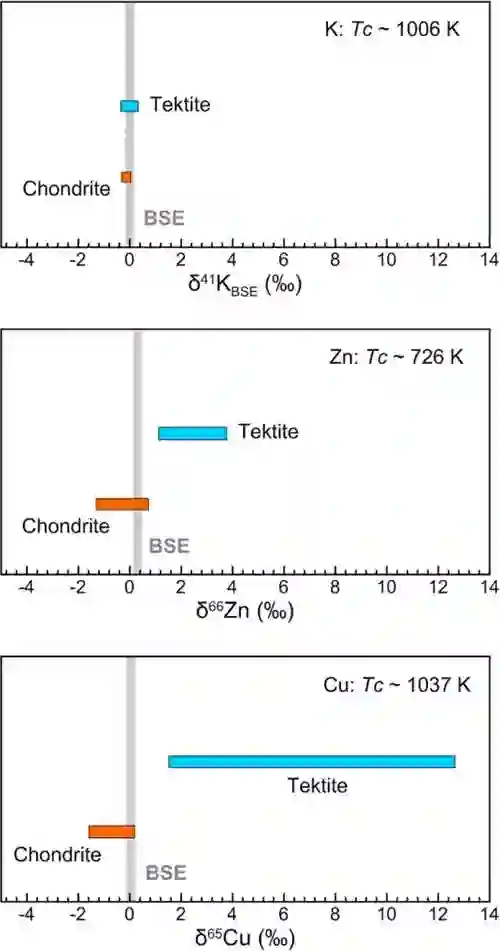 图:K、Zn和Cu同位素在全岩硅酸盐地球(BSE)、球粒陨石(Chondrite)和玻璃陨石(Tektite)中的分异程度对比
