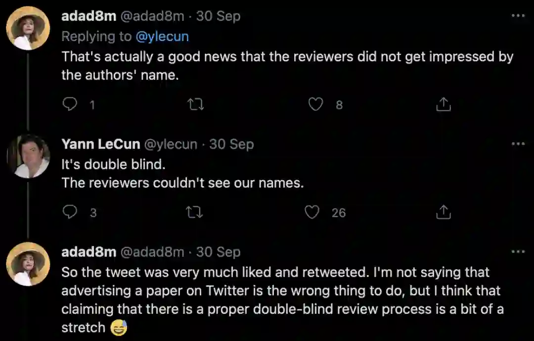 虽然NeurIPS采用「双盲审」的机制,但是网友犀利地指出,LeCun发的这条推文得到了很多人的点赞和转发。在此声称这是一个适当的双盲审过程实在有点牵强。