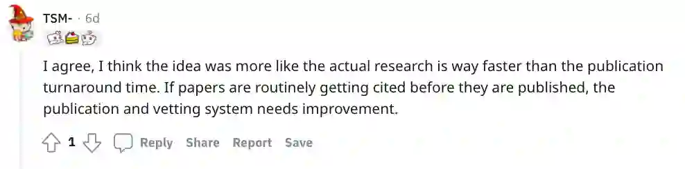 针对引用次数是否能代表论文质量这一问题,Reddit的网友也展开了激烈的讨论,有博主认为「一篇文章已经被引用了12次,然而在得到官方发表的时候还是十分艰难,这说明传统的会议和发表流程周期实在太长了,这个非常值得关注的问题」。