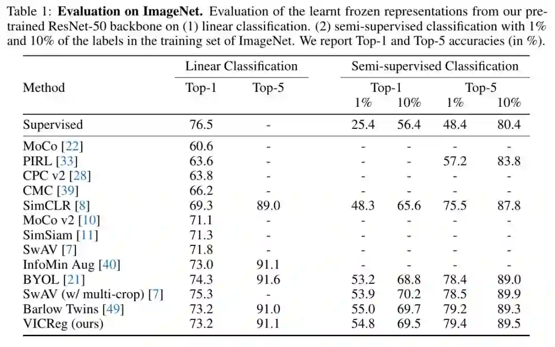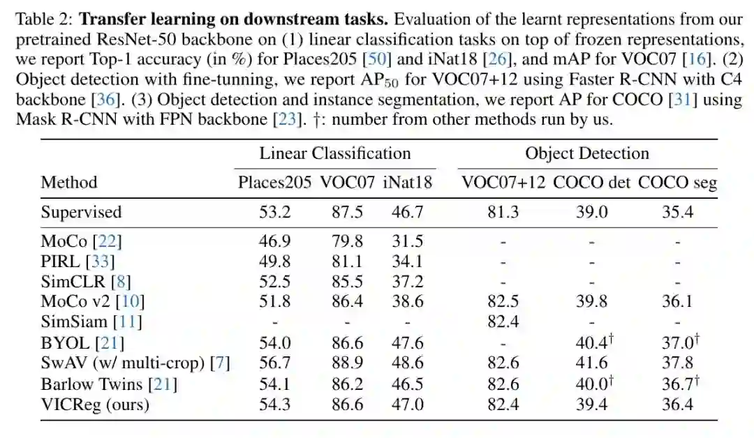 VICReg使用线性分类器头在ImageNet上,在低数据状态下的半监督ImageNet上,还有在下游任务的迁移学习上,都取得了有竞争力的结果。