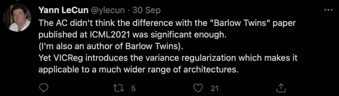 NeurIPS给出的拒稿理由是「VICReg」与发表在ICML2021上的「Barlow Twins」差异不大。