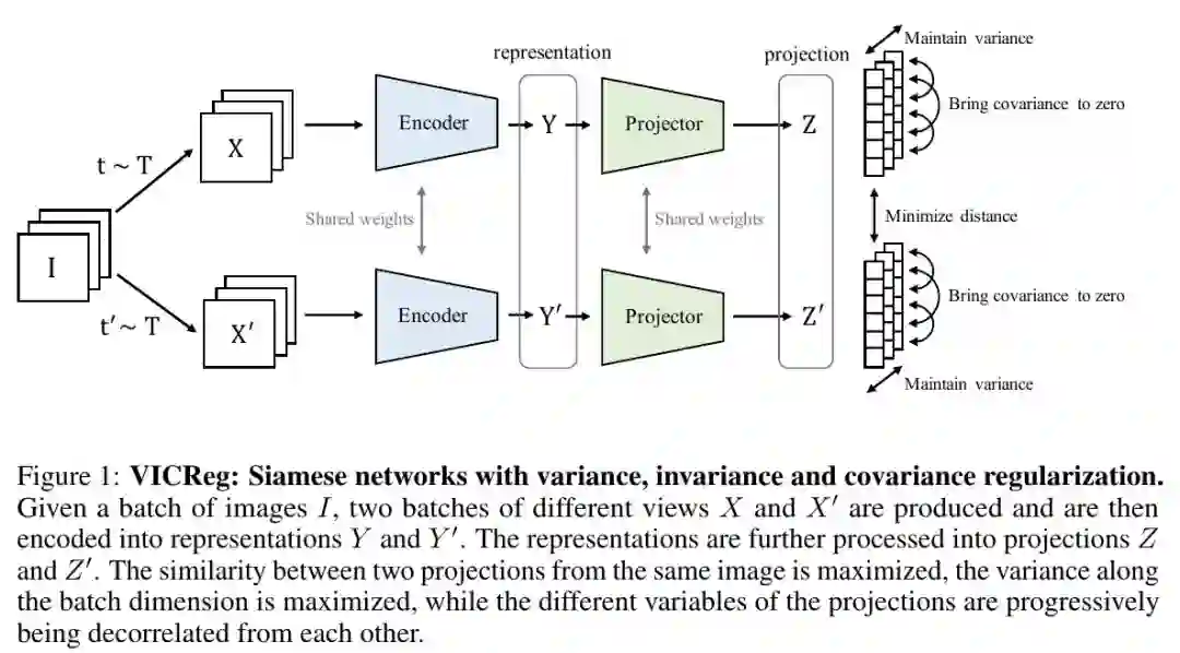 VICReg是一种非常简单有效的联合嵌入体系结构(Joint-Embedding Architectures,JEA)自监督训练图像表征学习方法,它将问题分解为三个不同的原则:用不变项学习对不同视图的不变性,用方差正则项避免表征的崩溃,用协方差正则项将信息分散到表征的不同维度。