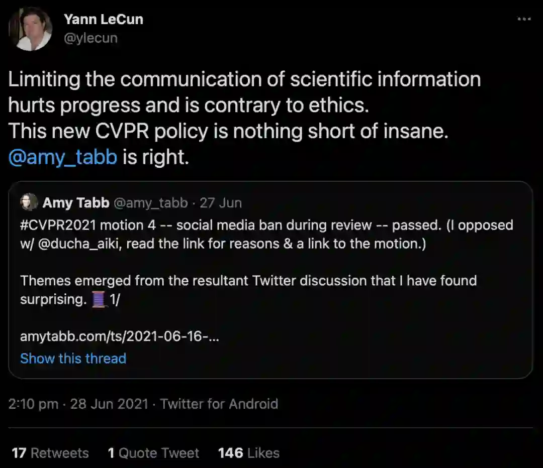 LeCun立刻就提出了反对:「限制交流会阻碍学术进步,而且违背道德规范。CVPR的这项新政策疯了!」