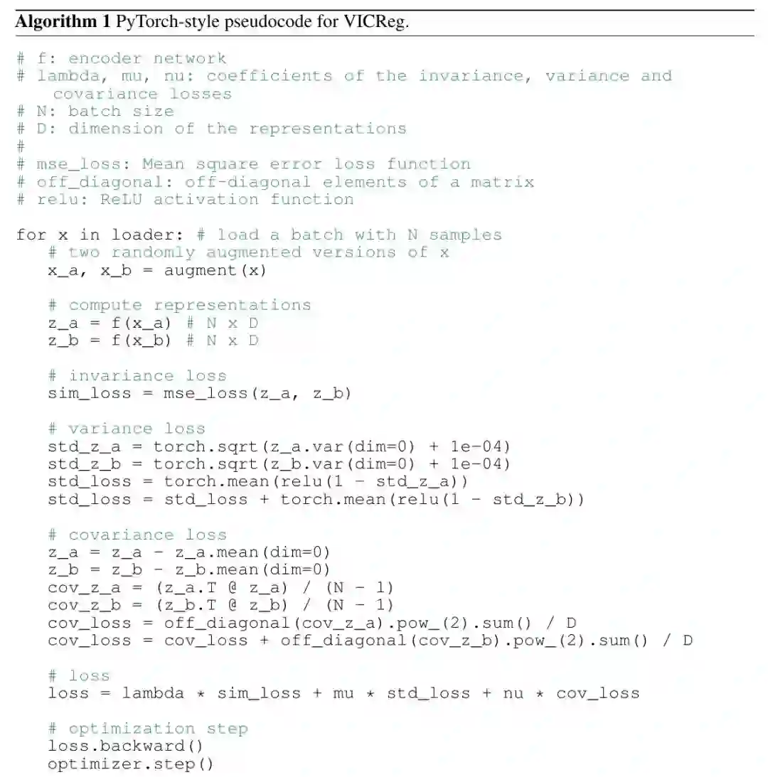 采用简单的方差铰链损失,很好地控制模型训练时的崩溃(见PyTorch伪代码)