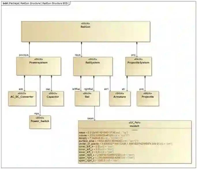 本文的目的是展示如何组合一些工具来协作设计一款新的武器系统——电磁轨道炮(electromagnetic railgun)。使用的技术和工具有:SysML架构建模(MagicDraw或Rhapsody)、基于物理的分析(Mathematica和Simulink)、机械CAD (NX)和需求管理(Jama)。这些工具由两个Intercax工具连接起来——MBSE平台Syndeia和参数解决方案ParaMagic (用于MagicDraw) 和Melody (用于Rhapsody)。