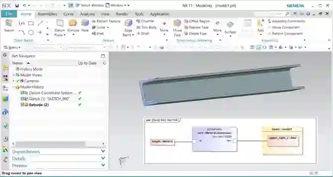 在设计流程,机械CAD将用于设计各个组件,包括关键的轨道。图9中,用NX设计了一个U型槽梁的3D CAD模型,它将作为轨道的代表。决定轨道炮性能的一个关键参数是轨道长度。