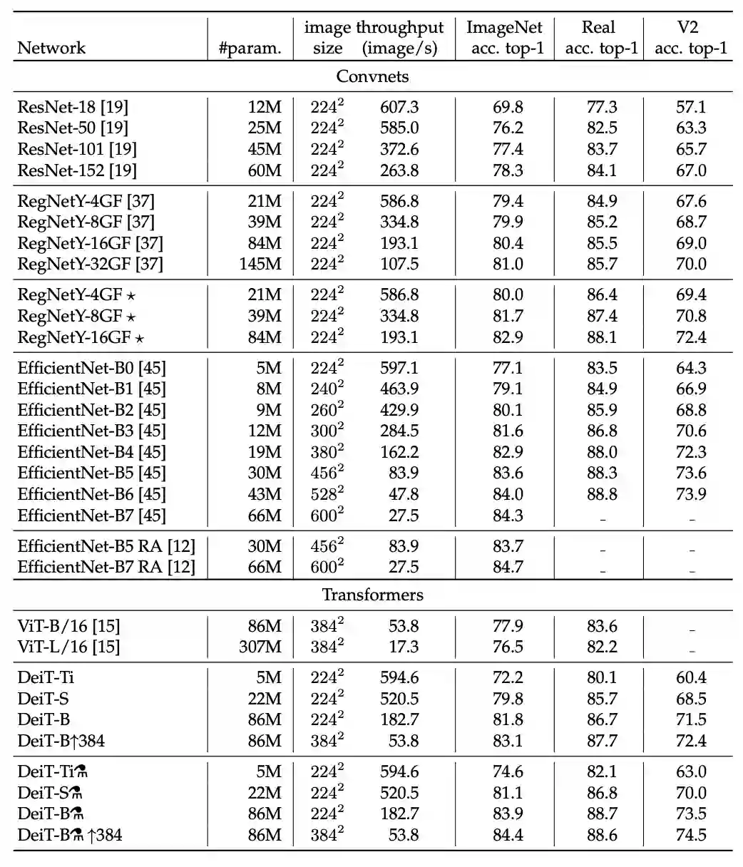 表 1:DeiT 架构变体。DeiT-B 是其中较大的模型,架构与 ViT-B 相同,但是训练策略和蒸馏 token 不同;DeiT-S 和 DeiT-Ti 是两个较小的模型。