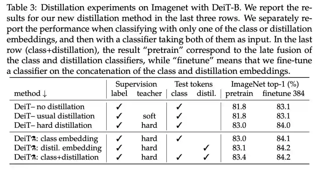 该研究提出的蒸馏策略进一步提升了性能,表明 class token 和蒸馏 token 能够提供对分类任务有用的补充信息:基于这两个 token 的分类器性能显著优于单独的 class 分类器和蒸馏分类器,不过单独的分类器依然超过了蒸馏基线方法。