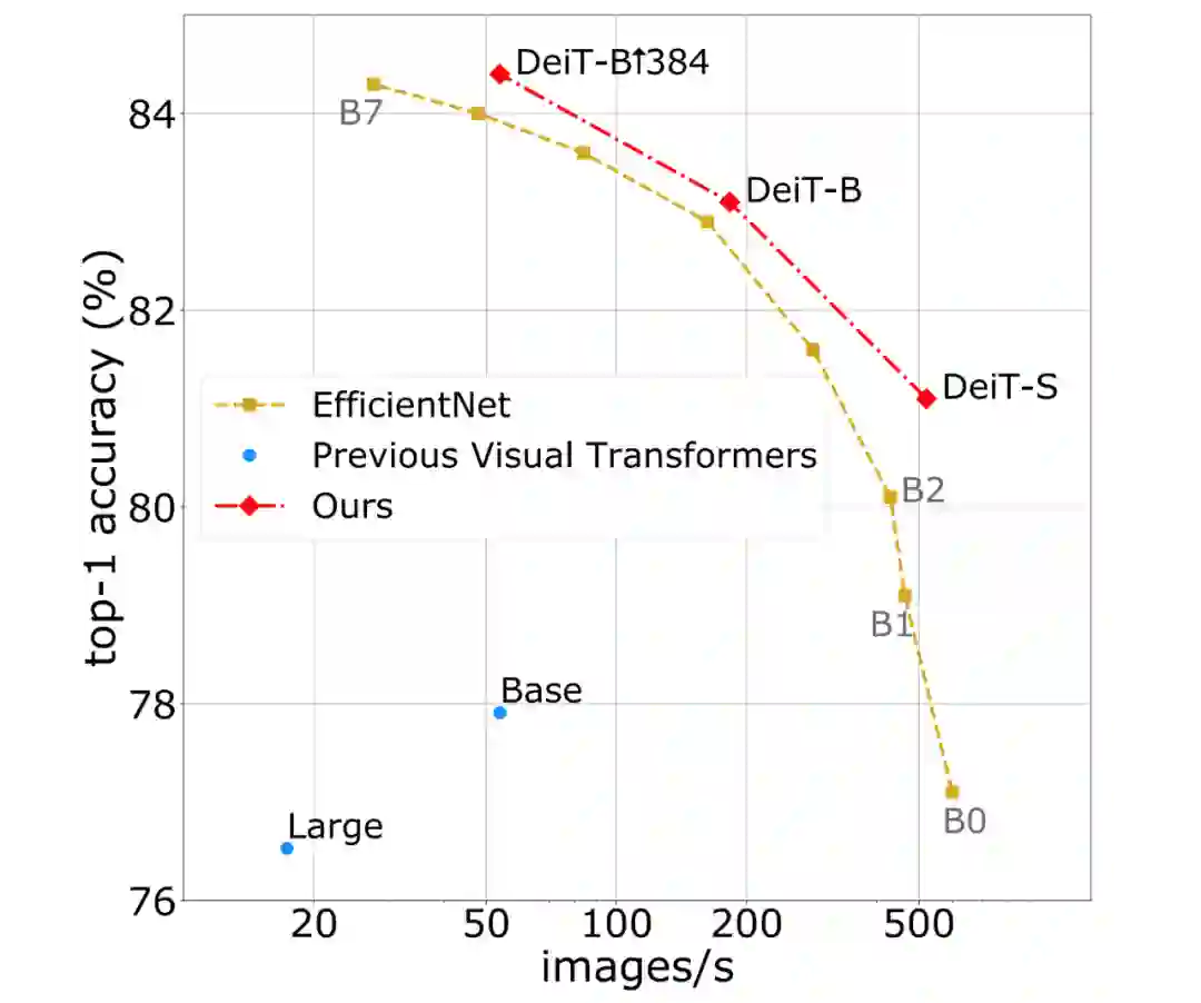 该研究提出的方法(DeiT 和带蒸馏的 DeiT)与以前的视觉 Transformer 模型以及 SOTA CNN 的性能曲线对比,这些模型均在 ImageNet 上训练而成。