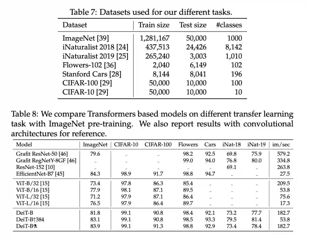 尽管 DeiT 在 ImageNet 数据集上表现良好,但通过迁移学习评估 DeiT 在其他数据集上的性能也很重要,这样可以度量 DeiT 的泛化性能。