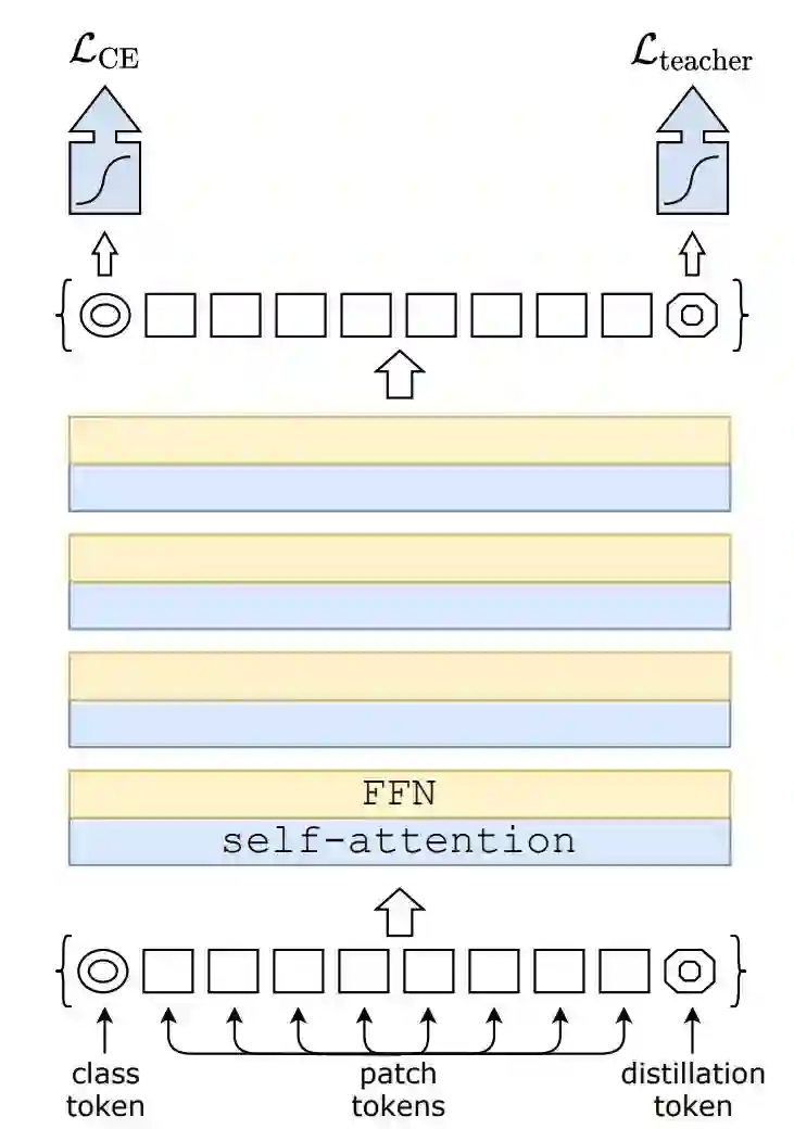 蒸馏流程如下图所示。研究者仅添加了一个新的蒸馏 token,它通过自注意力层与 class token 和 patch token 交互作用。蒸馏 token 的作用与 class token 类似,不过前者的目的是复制教师网络预测的(硬)标签,而不是正确标签。Transformer 的 class token 和蒸馏 token 输入均通过反向传播学得。