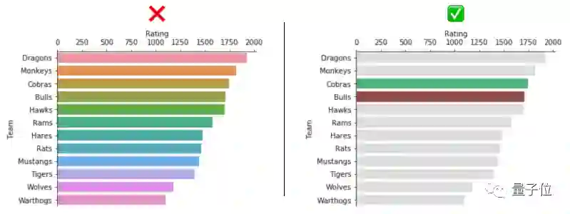 比如在这张图里,如果你只想强调Cobras和Bulls两个类目,那就不要把所有类目都加上颜色,可以选择把其他设计成灰色,给这两个类目加上颜色。