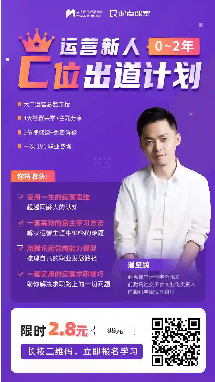 为此,「人人都是产品经理」旗下起点课堂,联合腾讯课堂请到了10年运营人,前腾讯高级运营经理@潘至鹏老师,带来为期4天的训练营——《0~2年运营新人·C位出道计划》。