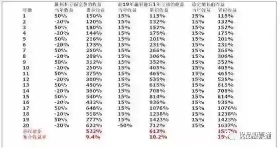 可以看到,在这张表格的中间一栏,每年都是15%的增长,到第二十年的时候,如果这个增长突然中断,假设这个年度的收益率回撤50%,你如果有一年表现比较差,那么这二十年积累的总体收益相差是非常大的。