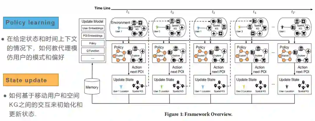 我们研究了增量移动用户分析问题。将空间KG集成到强化学习中,以逐步学习用户表示并生成下次访问预测。具体来说,我们将状态表述为用户和空间KG的组合,其中建模了用户与空间KG的交互,以基于时间上下文增量更新用户和空间KG的表示。实验观察到空间KG引入的语义信息,改进了用户表示的建模,以更好地理解用户模式和偏好。