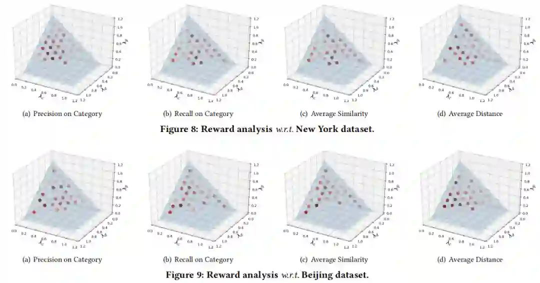 (3)奖励不同部分权重的影响。一个有趣的观察结果是,在“类别精确度”,“类别召回”和“平均相似度”的情况下,类别相似度 的贡献高于其他两个因素,但在“平均距离”情况下 ,距离 和POI 是否访问 的贡献超过类别相似度 。原因很直观,类别相似度 直接决定了策略训练的方向,以探索更多相似的POI类别,而 和 则指导策略找到与用户意图尽可能接近的POI。