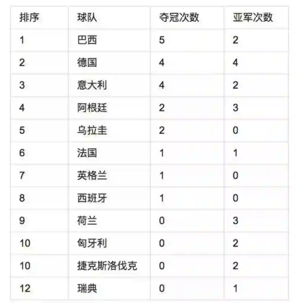 首先,强队一般指进过世界杯决赛的球队。这方面巴西夺冠 5 次,德国夺冠 4 次,是目前为止夺冠次数最多的两支球队。其余夺冠历史如下: