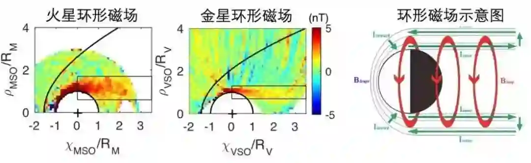 图1.火星(左)和金星(中)的环形磁场Bφ的观测结果和示意图(右)。