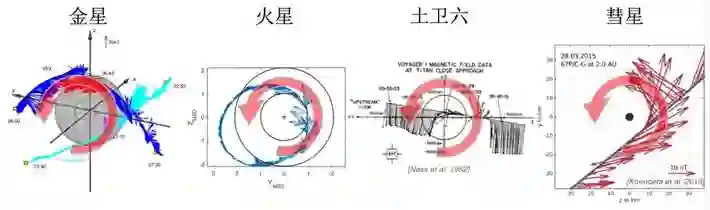 图3. 金星、火星、土卫六和彗星67P/C-G上都观测到了环形磁场现象(红色圆弧代表环形磁场结构,直线箭头代表观测到的磁场)。