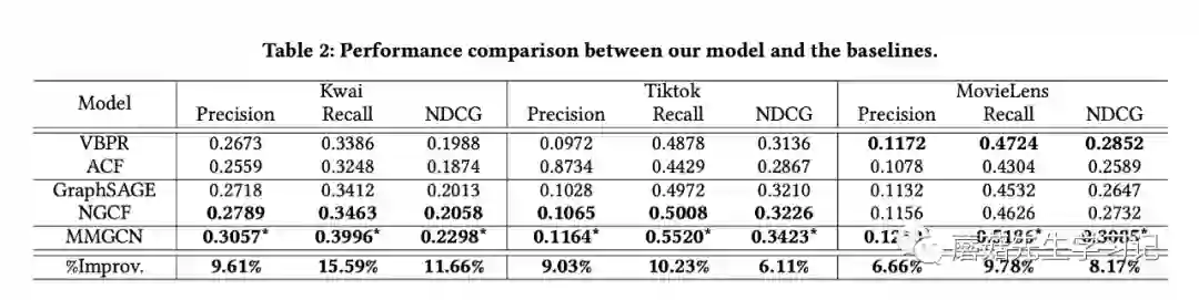 在实验部分作者使用了头条数据集tiktok,快手数据集Kwai,movie-lens进行实验。头条数据集3种模态都有,快手只有文本和图像。movie-lens作者手动爬取了youtube的预告片,并用resnet50提取关键帧的特征,使用FFmpeg抓取声音片断并用VGGish提起声音特征,使用Sentence2Vector从文本描述中提取特征。这个工作量是真大。