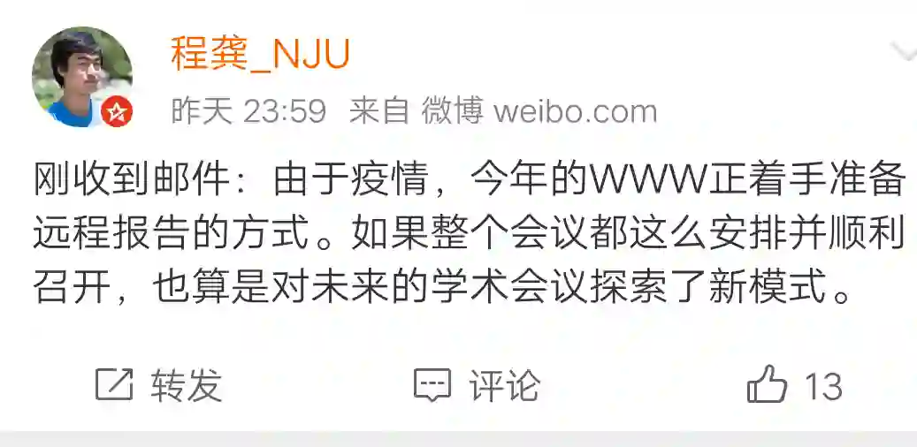 在前几天,南京大学计算机系的教师,程龚发微博表示由于疫情,今年在台北召开的WWW会议将着手准备远程报告的方式。这是继AAAI 2020 之后,又一个因疫情原因使用远程报告的国际顶级AI学术会议。