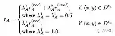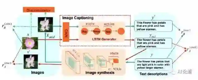 reconstruction reward 的计算依赖于 dual learning 过程。我们将 image captioning 作为 primal task A,将 image synthesis 作为 dual task B。例如,当我们从 A 开始时,过程如下:首先,我们用模型 A 为每个图片 x 生成一个中间描述 y_{mid}。然后,我们用模型 B 为中间描述 y_{mid} 反向生成一个图片 x’。最后,通过评测这两个过程的生成结果,我们可以采用强化学习同时提高模型 A 和 B 的效果。