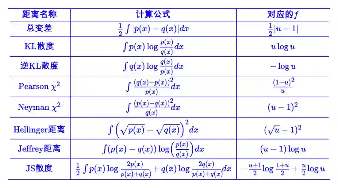 计算 f 散度有什么困难呢?根据定义 (1) ,我们同时需要知道两个概率分布 P , Q 才可以计算两者的 f 散度,但事实上在机器学习中很难做到这一点,有时我们最多只知道其中一个概率分布的解析形式,另外一个分布只有采样出来的样本,甚至很多情况下我们两个分布都不知道,只有对应的样本(也就是说要比较两批样本之间的相似性),所以就不能直接根据 (1) 来计算 f 散度了。