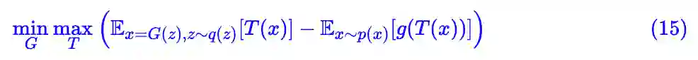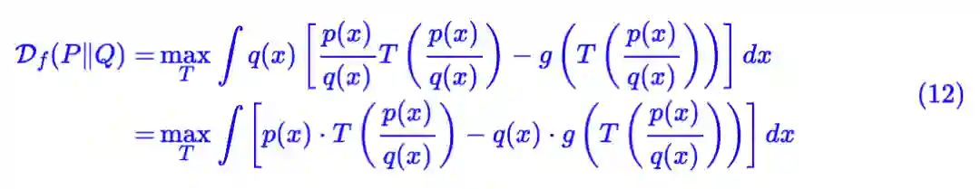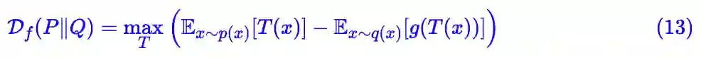 式 (13) 就是估计 f 散度的基础公式了。意思就是说:分别从两个分布中采样,然后分别计算 T(x) 和 g(T(x)) 的平均值,优化 T,让它们的差尽可能地大,最终的结果就是f散度的近似值了。显然 T(x) 可以用足够复杂的神经网络拟合,我们只需要优化神经网络的参数。