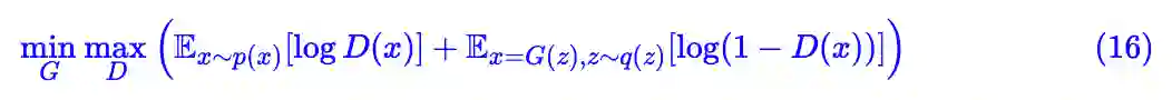 GAN 希望训练一个生成器,将高斯分布映射到我们所需要的数据集分布,那就需要比较两个分布之间的差异了,经过前面的过程,其实就很简单了,随便找一种 f 散度都可以了。然后用式 (13) 对 f 散度进行估计,估计完之后,我们就有 f 散度的模型了,这时候生成器不是希望缩小分布的差异吗?最小化 f 散度就行了。所以写成一个表达式就是: