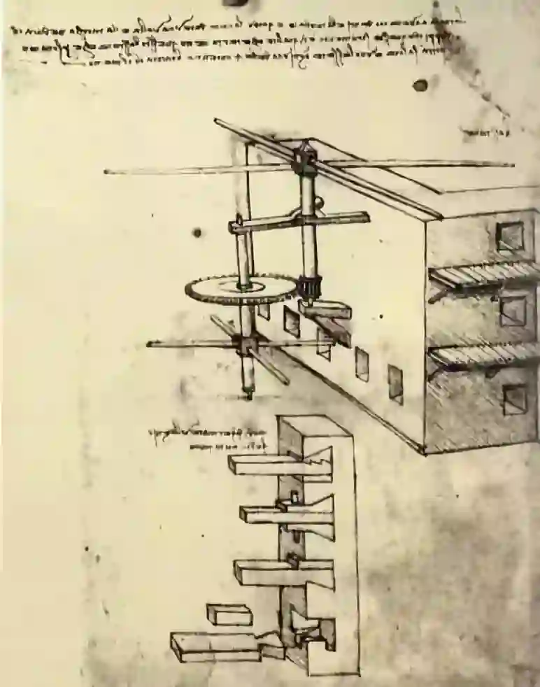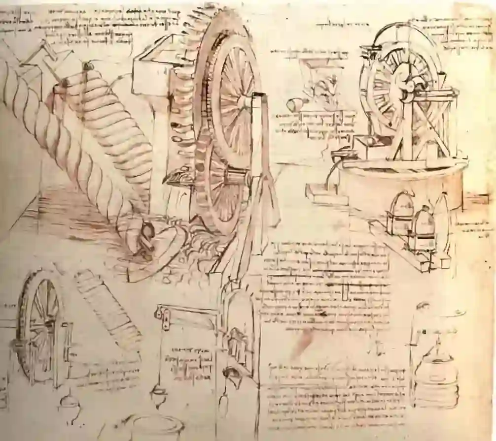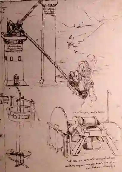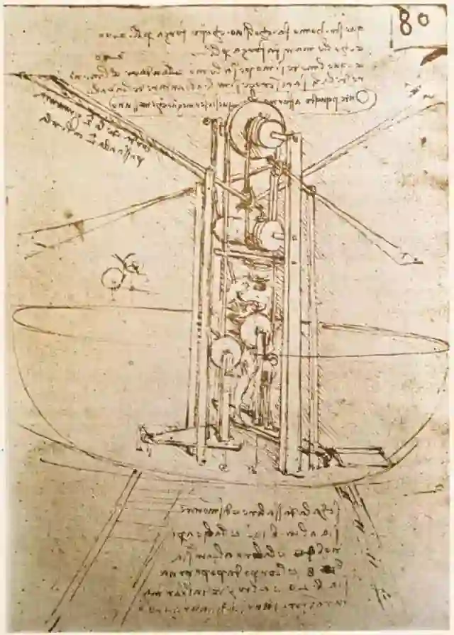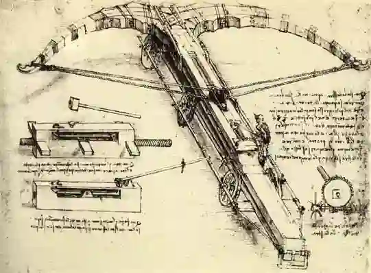在达·芬奇的笔记中能看到不少飞行装置,其中最著名的是飞机螺旋桨草图,经常被称为直升机设计的鼻祖。理论上,这个由亚麻布、绳索和支架构成的螺旋装置可以通过旋转升空,比莱特兄弟早了将近500年!当时,佛罗伦萨人的演出中经常有人物或道具从天而降,或者如魔术般的悬在半空。类似的笔记页中还有一些跟演出相关的内容,因此,这些飞行装置当时有可能是为了娱乐观众而设计的。