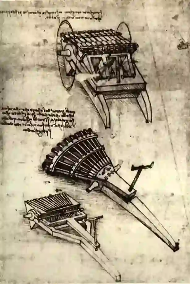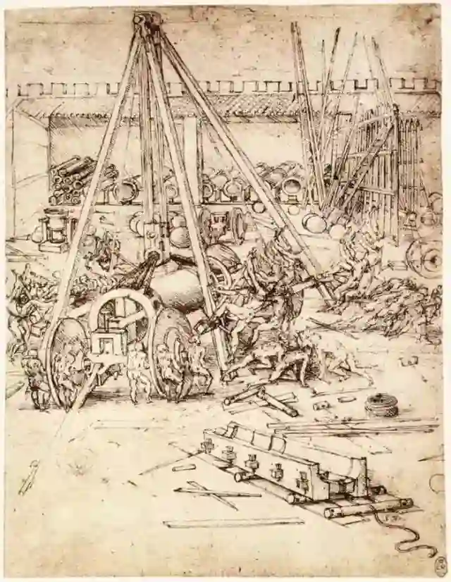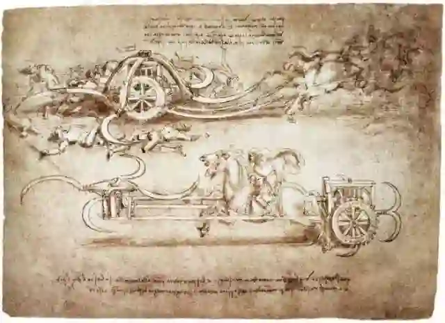 尽管后来达·芬奇从书上学习了诸多军事知识,确实画过许多构思巧妙的军事设备,有的甚至画了超过三十张图,而且细致、精确地画出了各个部位的构件,但其中只有一件最终从他的笔记本走上了战场。在达·芬奇的一生中,有很多这样只停留在构思阶段的从未完成的作品,包括绘画、纪念碑和发明。