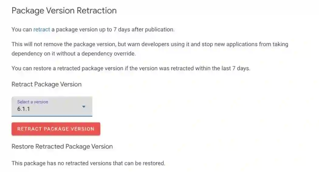 其次,我们还为发布者添加了另一个功能: 撤销已发布的 package 版本。当发布了有问题的 package 版本时,我们通常的建议是发布一个小幅升级的新版本来修复意外问题。但在极少数情况下,例如您尚未修复这些问题,或是您在原打算只发布一个次要版本时意外发布了一个主要版本,那么您就可以使用新的 package 撤销功能,作为最后的补救方法。此功能在 pub.dev 的管理界面中提供: