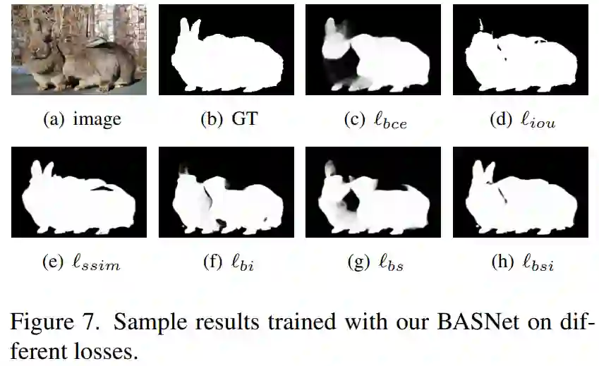为了进一步阐释损失的定性效果,研究者在不同的损失设置下对 BASNet 进行训练,结果如下图 7 所示。很明显,本研究提出的混合损失取得了非常好的定性结果。