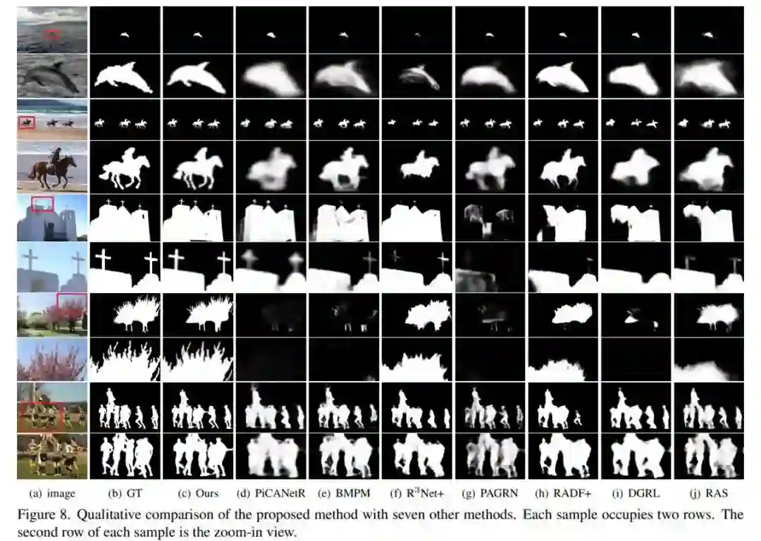 最后,为了进一步阐释 BASNet 的优越性能,研究者在下图 8 中展示了与其他 7 种同类方法的定性比较结果,可以看到,BASNet 可以对不同挑战性场景中的显著性目标实现准确分割。