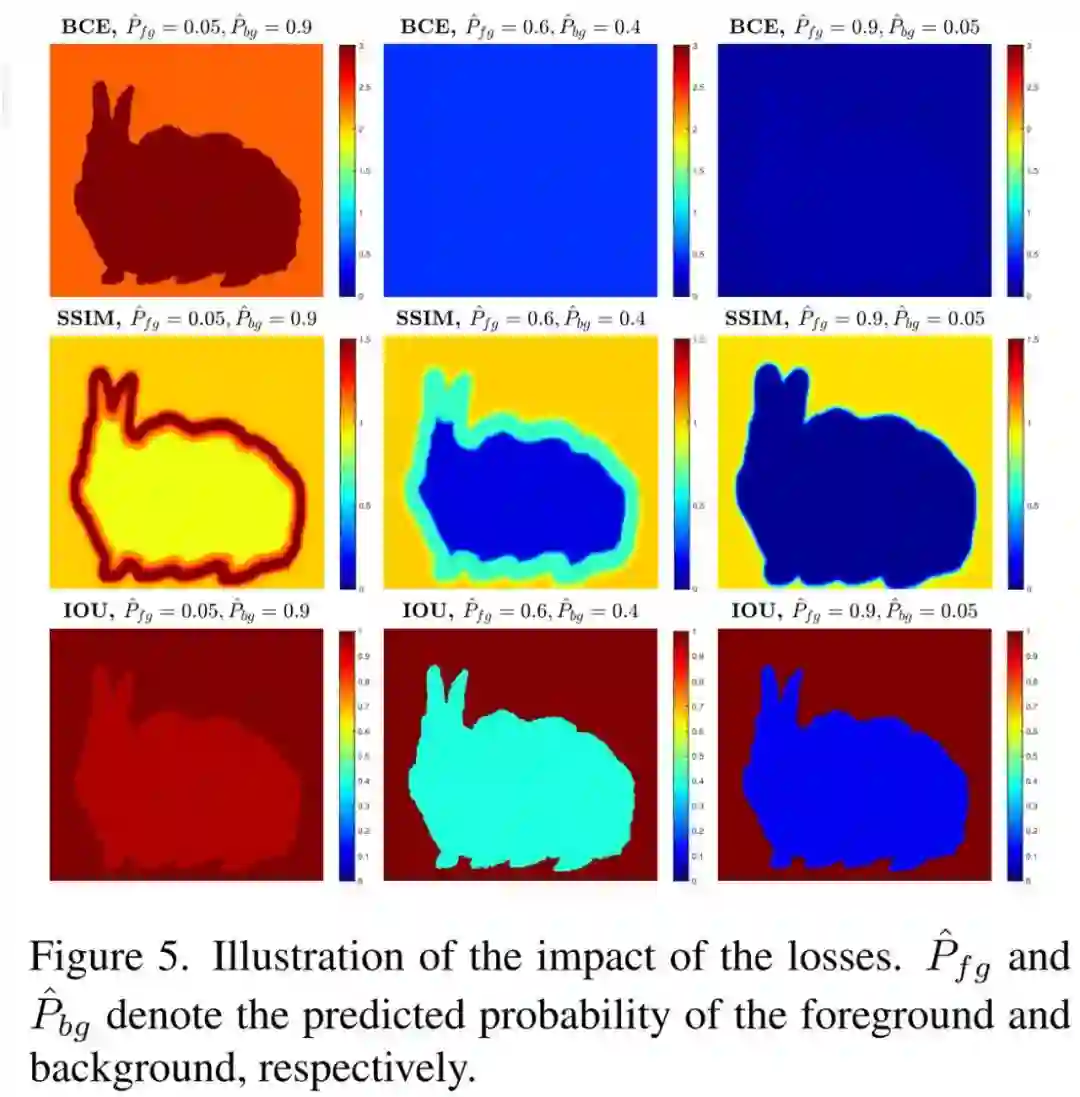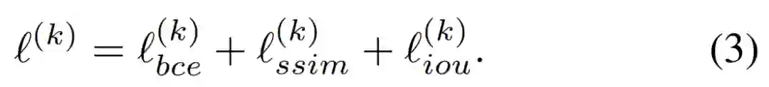 其中,ℓ^ (k)_ bce 表示 BCE 损失,ℓ ^(k)_ ssim 表示 SSIM 损失, ℓ ^(k)_ iou 表示 IoU 损失,这三种损失的影响如下图 5 所示: